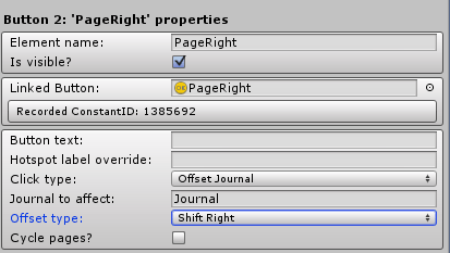 Now set the Click type of both to Offset Journal. Enter the name of your Journal element (in this case, Journal) into the Journal to affect box. The only difference between the two should be the Offset type, which should be Shift Left for PageLeft and Shift Right for PageRight.