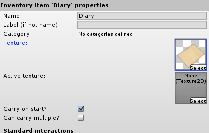 Our diary's UI is now complete, but we need a way to turn it on. We'll let the player access it from their Inventory, so we'll need to provide an Inventory item. Open the Inventory Manager, and click Create new item. Rename the new item Diary, give it an appropriate Texture, and check Carry on start?.