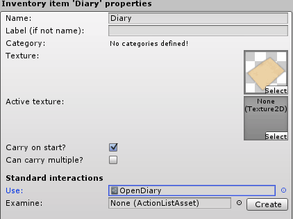 We can do this by supplying an ActionList asset into the Item's Use field. Find the field in the items Standard interactions, and click Create to automatically create and assign a new ActionList asset file. Rename the asset OpenDiary: