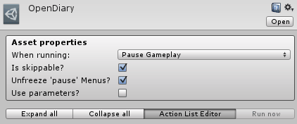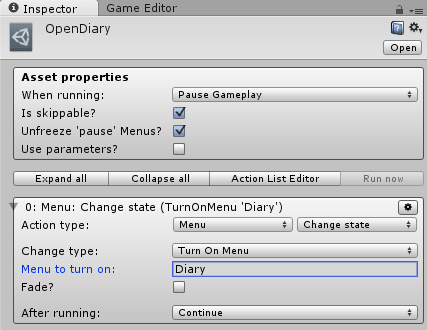 Re-select the OpenDiary asset and view it's Inspector. We'll be making our ActionList slightly more complex, so let's use the ActionList Editor window to build it. Open the window by clicking Action List Editor in the Asset properties box.