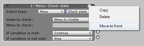 Right-click inside the window and click Insert new Action. Change the new Action's type to Menu: Check state, and then click on the cog icon to it's top-right, and click Move to front.