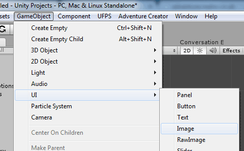 We'll make this diary using Unity's UI system, though we could also build it using AC's own Menu system. Begin by creating a new Text object by choosing GameObject → UI → Image from the top toolbar.