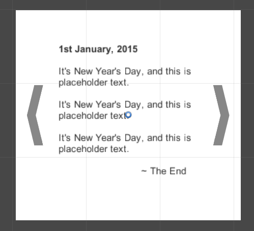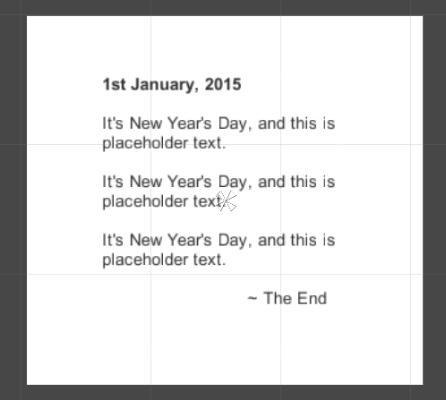 We now need a Text object that will display above it, to store the diary's text. With DiaryCanvas selected, create a new UI Text object from the same toolbar menu. Again, re-position it and re-style it as appropriate. It will help to enter some placeholder text at this stage: