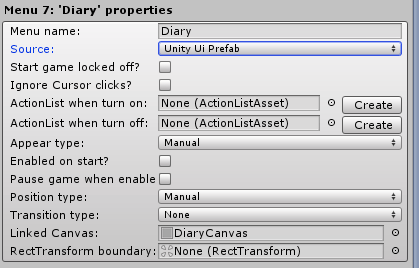 Rename the Menu Diary, and set it's Source to Unity Ui Prefab. Leave the Appear type as Manual, and drag the DiaryCanvas (the prefab, not the scene object) into the Linked Canvas field.