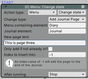 Change the Cutscene's Action to another Menu: Change state, and set the Change type to Add Journal Page. Enter in the name of your Diary Menu's name, and Journal element's name, into the fields below, as well as some text for the new page: