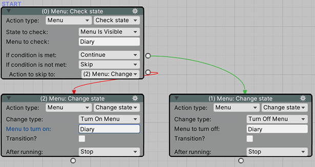 Select the OpenDiary asset and view it's Inspector. Click Add new Action, and set the new Action's type to Menu: Change state. Leave the Change type as Turn On Menu, and enter the name of your diary Menu as the Menu to turn on (in this case, Diary).
