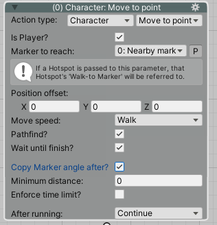 Going back to our Character: Move to point Action, click the P button to the right of the Marker to reach field to override it: