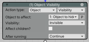 Next, create an Object: Visibility Action, and set Visibility to Invisible. Again, leave the Object to affect field empty.