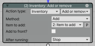 Create a final Inventory: Add or remove Action, and set the Add or remove field to Add. The Inventory item field will set itself to the first item defined in the Inventory Manager - but don't worry about that.