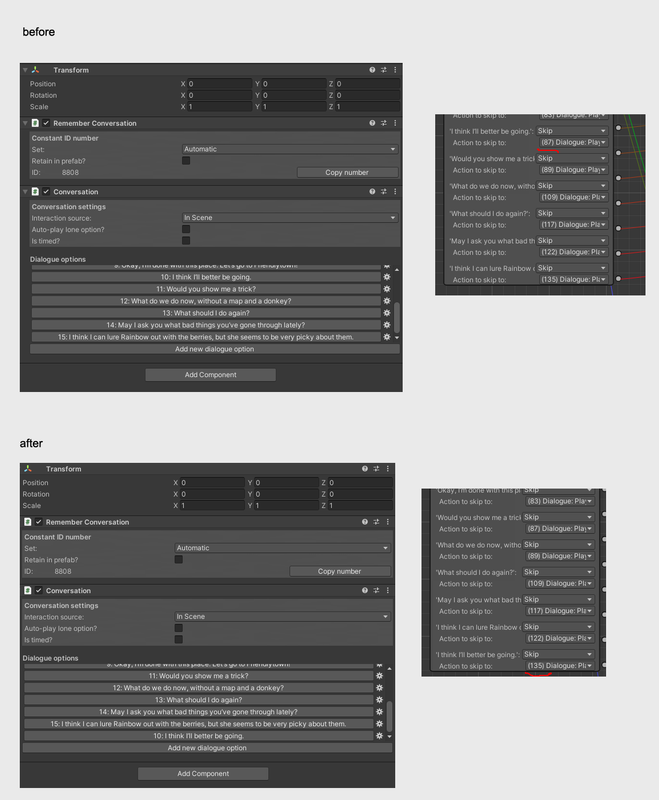 When I re-arrange the dialogue options in a conversation it breaks the setup of the conversation actions. For example if I move option 3 to last position, the assigned nodes just stays the same. I would expect the nodes re-order as well so I don't have to rewire the dialogue:play speech actions.