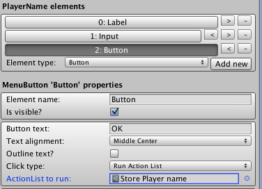 We need to call this Menu ActionList when the Button is clicked, so go back to the Menu Manager, and set the Button's Click type to Run Action List, and set the ActionList to run as "Store Player name".