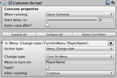 "When we wish to turn on the Menu, we can use another Menu: Change state Action in a Cutscene:"