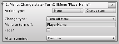 Next, create a Menu: Change state Action, set the Change type to Turn Off Menu, and enter "PlayerName" as the Menu to turn on.