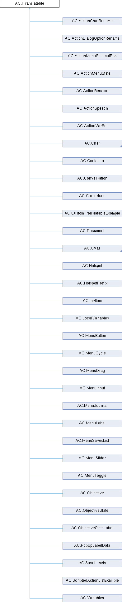 Implemented in AC.ActionCharRename, AC.ActionDialogOptionRename, AC.ActionMenuSetInputBox, AC.ActionMenuState, AC.ActionRename, AC.ActionSpeech, AC.ActionVarSet, AC.Char, AC.Container, AC.Conversation, AC.CursorIcon, AC.CustomTranslatableExample, AC.Document, AC.GVar, AC.Hotspot, AC.HotspotPrefix, AC.InvItem, AC.LocalVariables, AC.MenuButton, AC.MenuCycle, AC.MenuDrag, AC.MenuInput, AC.MenuJournal, AC.MenuLabel, AC.MenuSavesList, AC.MenuSlider, AC.MenuToggle, AC.Objective, AC.ObjectiveState, AC.ObjectiveStateLabel, AC.PopUpLabelData, AC.SaveLabels, AC.ScriptedActionListExample, and AC.Variables.
