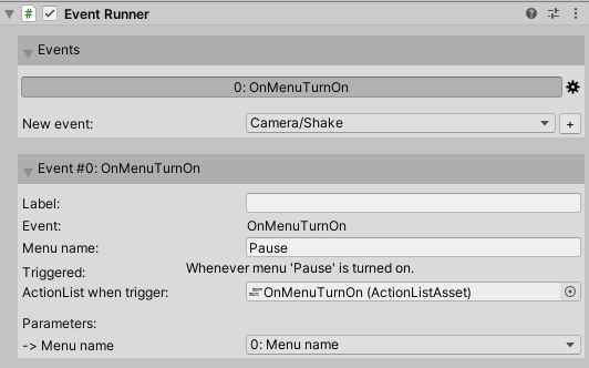 We're only interested in the Pause menu being turned on - so type Pause into the Menu name field, then click the + icon underneath to create a new ActionList when trigger asset: