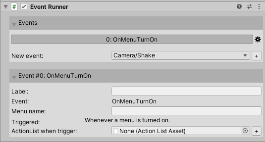 Assuming our Title menu is displayed in its own scene, add an empty GameObject and attach AC's Event Runner component. Use the popup field at the bottom to create a new Menu: Turn on event. By default, this will be run whenever any Menu is turned on: