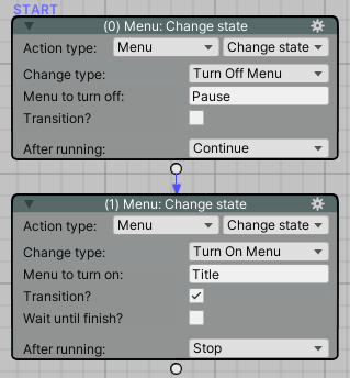 Open up this new ActionList asset, which will run when the Pause menu is turned on. We'll want to prevent this, and instead turn on the Title menu. We can do this with a pair of Menu: Change state Actions:
