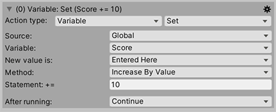 We can use the Variable: Set Action to increase the Player's score - e.g. when they solve a puzzle. From any ActionList (e.g. a Cutscene or Interaction), create such an action. Set the Variable to affect as Score, and change the Method to Increase By Value. Then enter 10 into the value box.