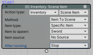 Running the Action now will cause the Sword item that's in our Inventory to be removed at the same time the the prefab is spawned in the scene.