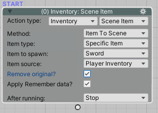 If we were to run this Action, it would cause a copy of our Sword prefab to be spawned in the scene - but it won't be the one from the Inventory, just a copy. To have it instead move the actual Sword that's in our Inventory, set the Item source to Player Inventory, and check Remove original?: