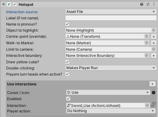 The last step is just to make sure that this parameter is assigned to the instance of the Sword prefab in the scene. We can do this by going back to our Hotspot Inspector - which has since updated itself to reflect recent changes - and set the Use interaction's Hotspot parameter to Item to remove: