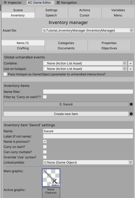 To start with, we'll make sure we have an item defined in the Inventory Manager's Items tab, with a Name and Main graphic defined: