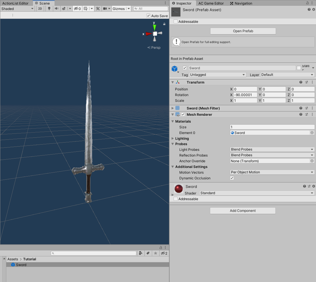 For the 3D Demo's Sword, a 3D model can be found in Assets -> AdventureCreator -> Demo -> Models -> Props -> Sword. Select the model and drop it into the scene. Then make it a prefab - by dragging it from the Hierarhcy window into the Project window - then remove from the scene: