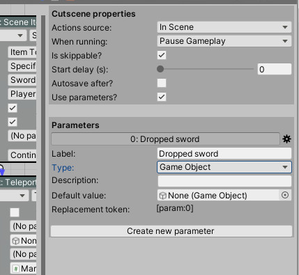 To do this, we'll make use of parameters, In the ActionList's Properties panel, define a new GameObject parameter named Dropped sword: