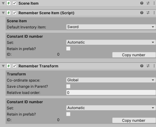 First, attach the Scene Item component. This has no Inspector, but is necessary for the next component: Remember Scene Item.