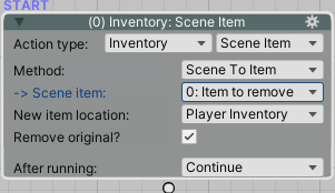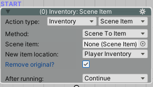 The ActionList asset need only consist of a single Inventory: Scene item Action, which can both remove the object from the scene, and place it in the Inventory. We can do this by setting its Method to Scene To Item, the New item location to Player Inventory, and checking Remove original?.