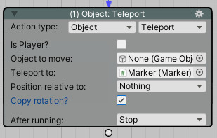 To have the spawned Sword appear at this Marker, we'll use the Object: Teleport Action. Add this Action to the ActionList, have it reference the new Marker, and check Copy rotation: