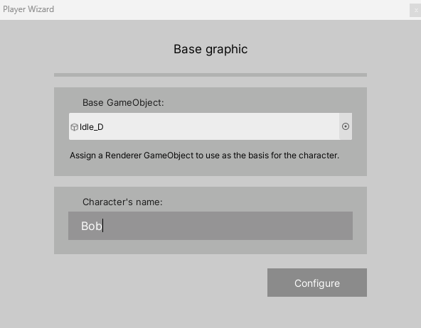 This will open up the Character Wizard, which we can use to generate the character after filling in some details. First, we'll need to assign a Base GameObject - if the sprite was selected beforehand, it'll be assigned here automatically. Name the character, and then click Configure: