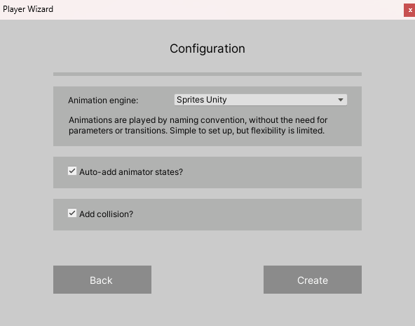 On the next page, we can choose an Animation engine. Here, we'll leave it as the default, Sprites Unity. To have the wizard automatically generate an Animator Controller, click Auto-add animator states?. Then, click Create to create the character: