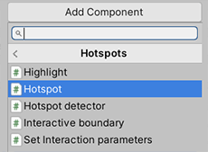 You can add a Hotspot via the Add component menu at the bottom of their Inspector - either by typing in the name or selecting Adventure Creator → Hotspots → Hotspot.
