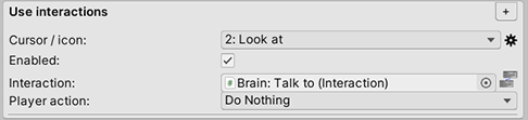 From here, you can choose what kind of Interaction it is. You can define what choices are available from the Cursor Manager. The Player action popup box determines what the Player character does before the Interaction occurs.