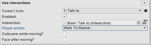 If you wish for your Player character to move towards the NPC before interacting with him, you can define a Walk-to marker that the Player will move to. This can be auto-created in the Hotspot's Inspector, and then positioned in the Scene window.