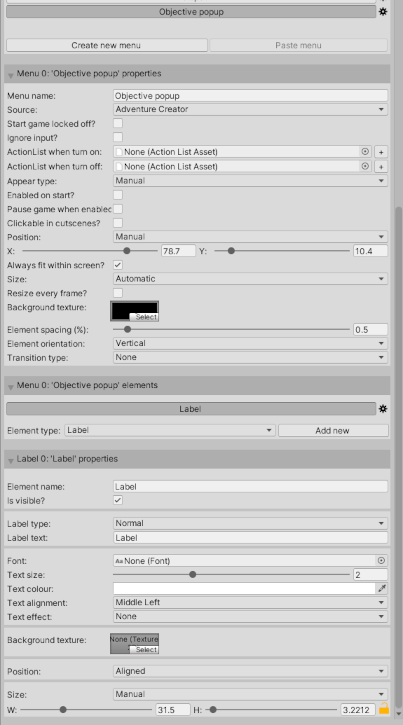 This pop-up will be a Menu. In the Menu Manager, create a new Menu and name it "Objective popup". Set its Appear type to Manual, and create a new Label element. Set the styling options to suit, but here we've just gone with a simple black box in the upper-right corner: