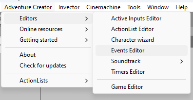 The Events Editor can be accessed from the top toolbar, under Adventure Creator -> Editors -> Events Editor: