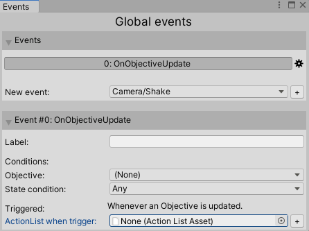 Leave the fields as their default values, and then click the + icon beside the ActionList when trigger field. This will create a new ActionList asset file named OnObjectiveUpdate. Notice the Parameters box that now appears below: the asset's Objective parameter will be set to the Objective that is being updated.