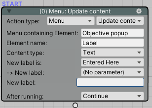 Before we show the Menu, we'll first amend the Label element so that it displays the name of the updated Objective. To do this, we'll use the Menu: Update content Action. Set the Menu and Element names to match the Menu we've just created:
