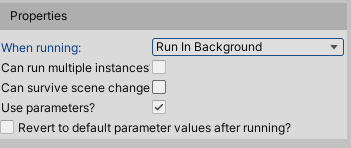 Finally, we'll have the ActionList run in the background so that it doesn't interfere with gameplay. This can be set via the When running field in the Properties tab: